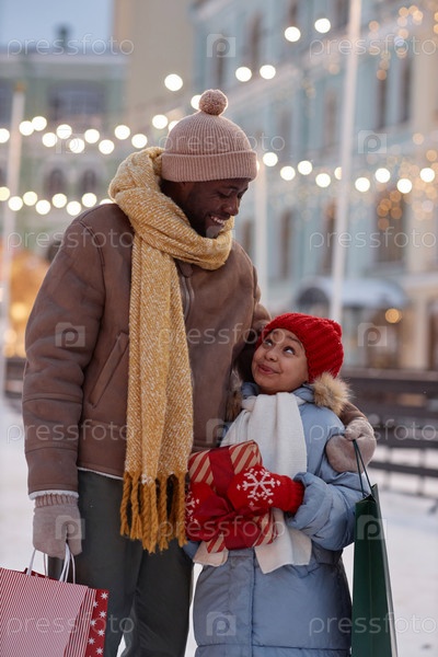Черная девушка держит рождественский подарок и ходит с отцом зимой