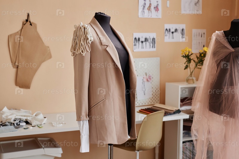 Новый бежевый блейзер с украшением на верхней части рукава, висящий на манекены