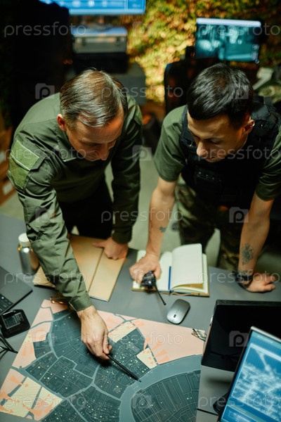 Верхний угол двух военных офицеров, обсуждающих тактику и стратегии армии