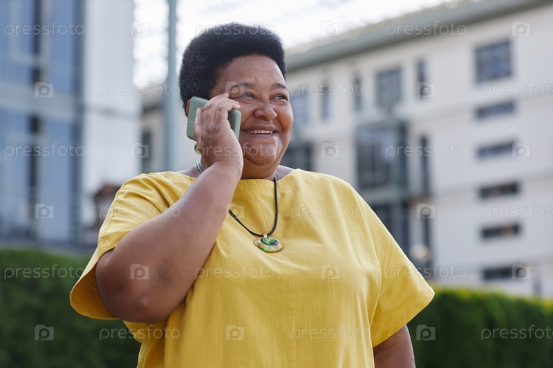 Современная чернокожая пожилая женщина разговаривает со смартфоном на открытом воздухе и счастливо улыбается