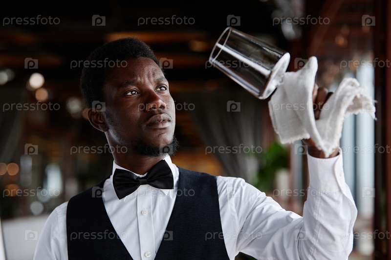 Чернокожий молодой человек как элегантный официант, полирующий очки в ресторане