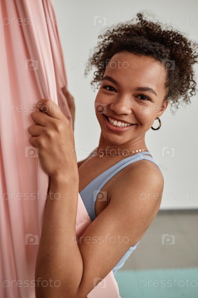 Молодая чернокожая женщина улыбается перед камерой на гамаке в классе воздушной йоги