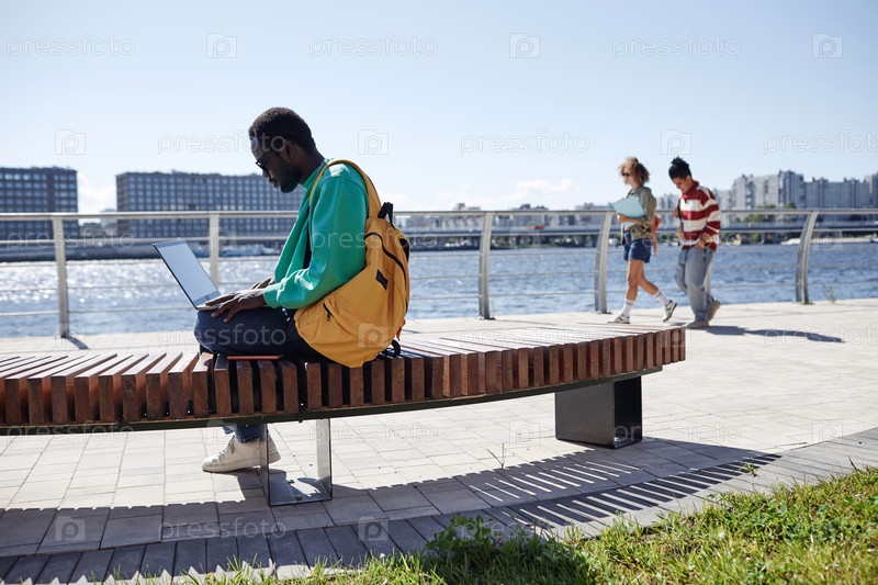Молодой чернокожий мужчина использует ноутбук на открытом воздухе, отдыхая на скамейке в парке Риверсайд