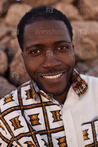 Улыбающийся афроамериканец, одетый в традиционный принт