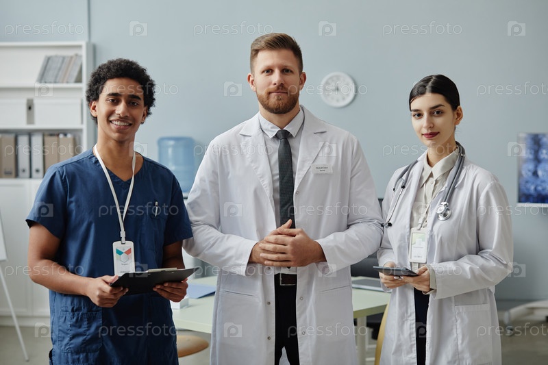 Разнообразная группа врачей улыбается на камеру в интерьере клиники