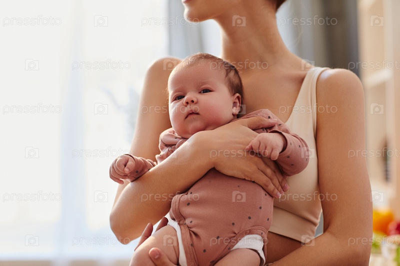 Мирное новорожденное в бодисуйте, сидящее на руках матери