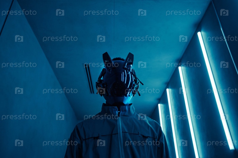Человек, носящий киберпанкскую роботомаску в синем неоне