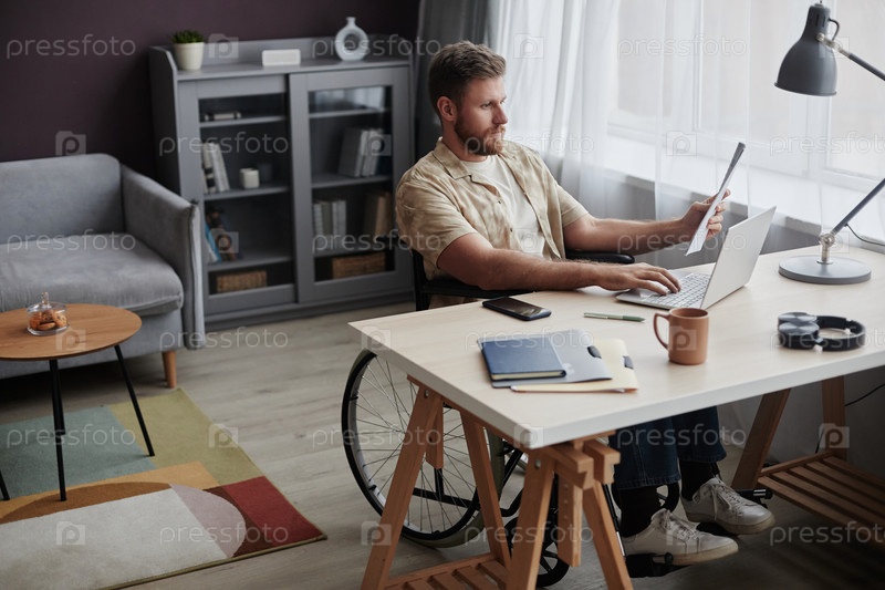 Человек с инвалидностью работает из дома и читает документы