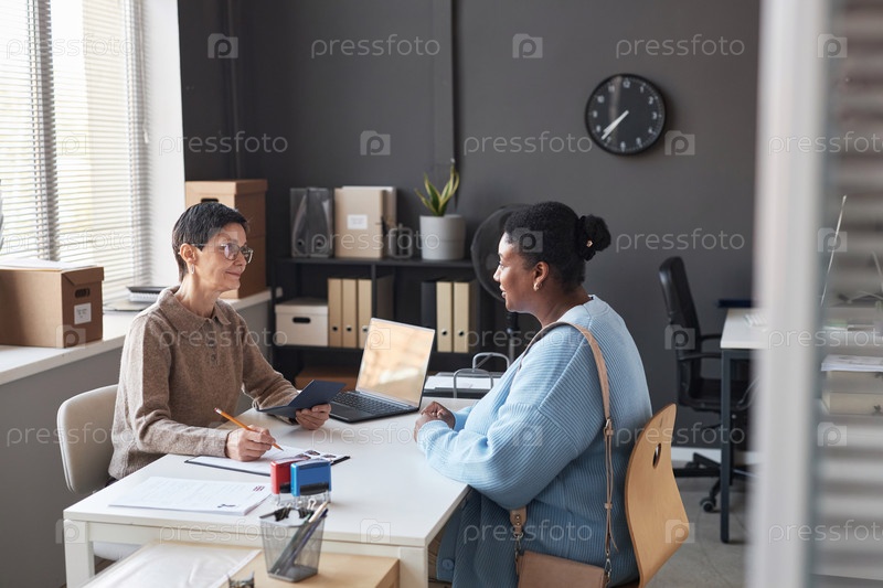 Молодая афроамериканка-заявительница отвечает на вопросы менеджера