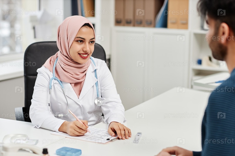 Улыбающийся мусульманский медицинский специалист консультирует пациента