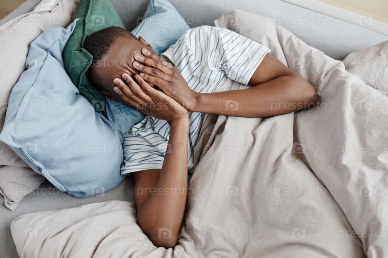 Вид сверху афроамериканского мужчины в одеялах, борющегося с депрессией