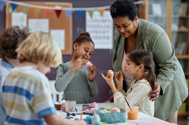 Разнообразная группа маленьких детей рисуют пасхальные яйца, наслаждаясь классом искусств и ремесел