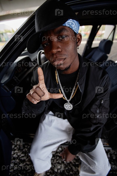 Африканский американец в черном пиджаке-бомбардировщике, шляпе и белых джинсах