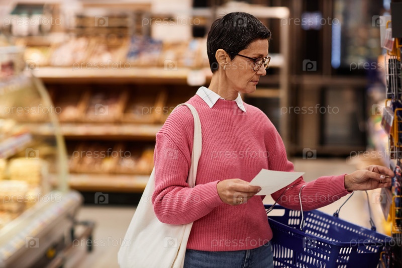 Женщина выбирает продукты в супермаркете и держит список покупок