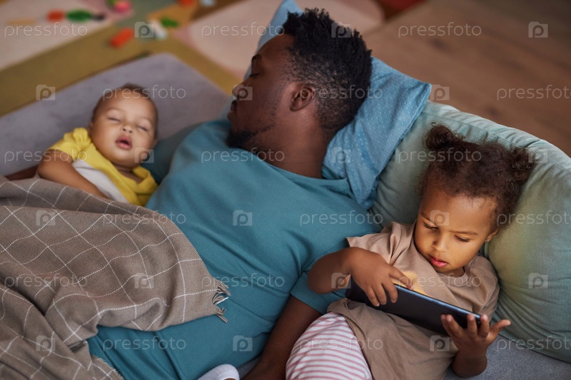 Маленькая чернокожая девочка использует смартфон со спящим отцом во время сна
