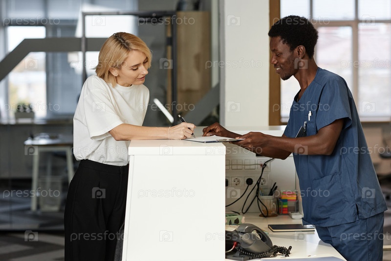 Боковой вид молодого афроамериканского клинициста-мужчины, помогающего клиентке