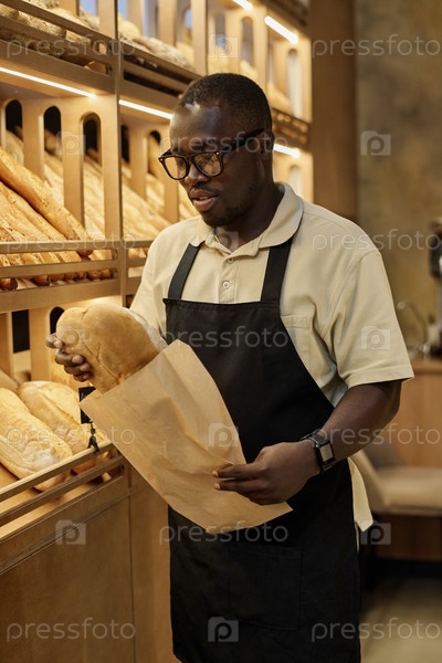 Вертикальный портрет чернокожего молодого человека, держащего буханку свежего хлеба в пекарне