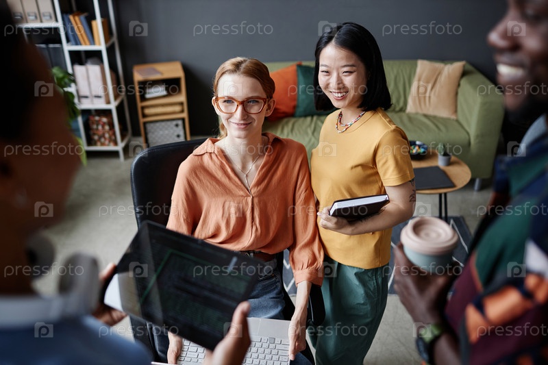 Группа улыбающихся молодых ИТ-специалистов, обсуждающих проект в офисе