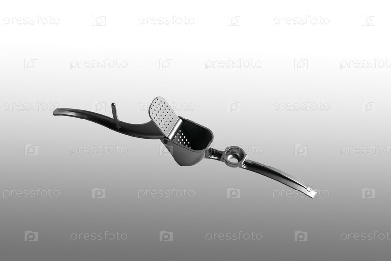 Пресс для чеснока. Крупный план. Изолированные на сером фоне