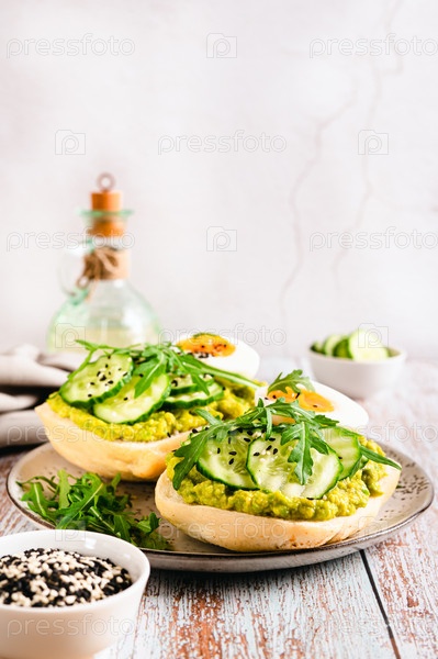 Сэндвичи на чиабатте с авокадо, огурцом, яйцом и рукколой на вертикальной тарелке