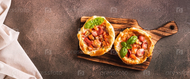 Чикагский пирог с пиццей с помидорами, сыром и колбасой на деревянной доске, вид сверху веб-баннер