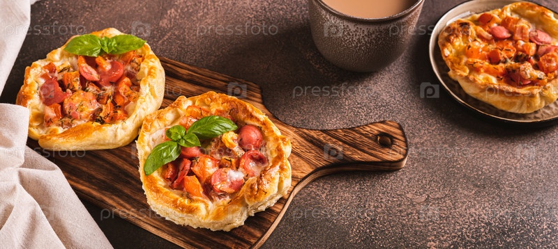 Чикагский пирог с пиццей с колбасой, помидорами и сыром на доске на столе веб-баннер