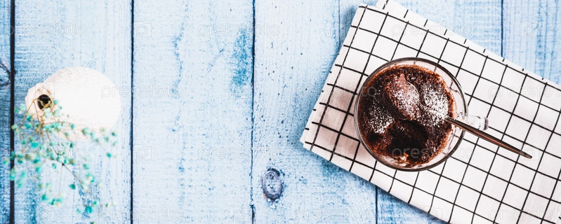 Домашний сладкий торт в кружке, приготовленный в микроволновой печи, на столе, вид веб-баннера