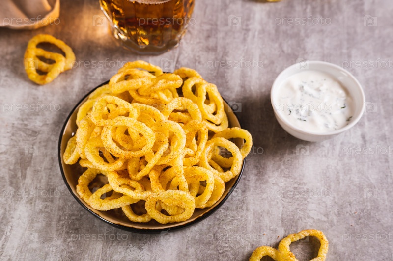 Домашние жареные луковые кольца на тарелке и соус на столе