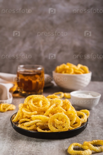 Луковые кольца, соус и пиво в стакане на столе, вертикальный вид