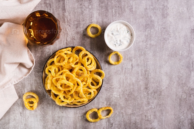 Луковые кольца, соус и пиво в стакане на столе, вид