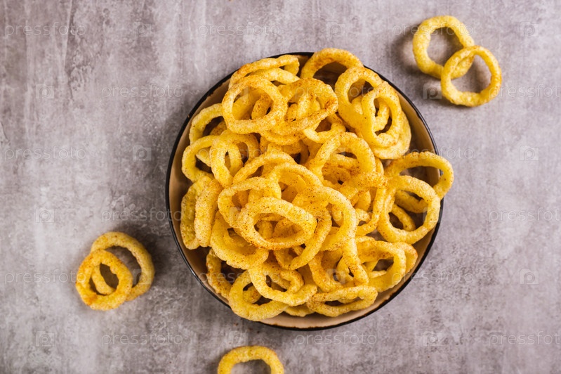 Крупный план луковых колец на тарелке на столе, вид сверху
