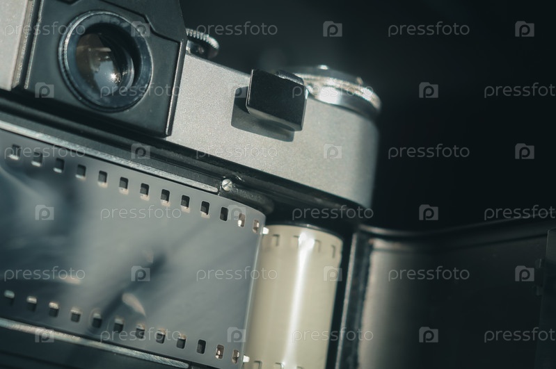 Крупный план задней части советского пленочного фотоаппарата с открытой крышкой отсека для пленки. Темный фон, пространство для копирования, глубокие тени, горизонтальная композиция