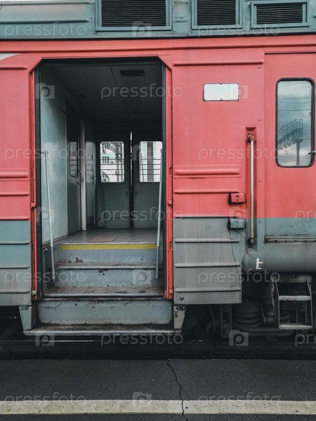 Открытый входной проем в вагон электропоезда. Пассажирский вагон железной дороги
