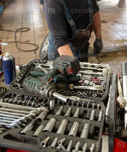 Избирательный фокус ящика с инструментами механика с инструментами в ящиках, автомеханик в мастерской