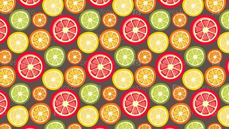 Цитрусовый узор с кружочками лимона, апельсина, мандарина, лайма и грейпфрута на темном фоне