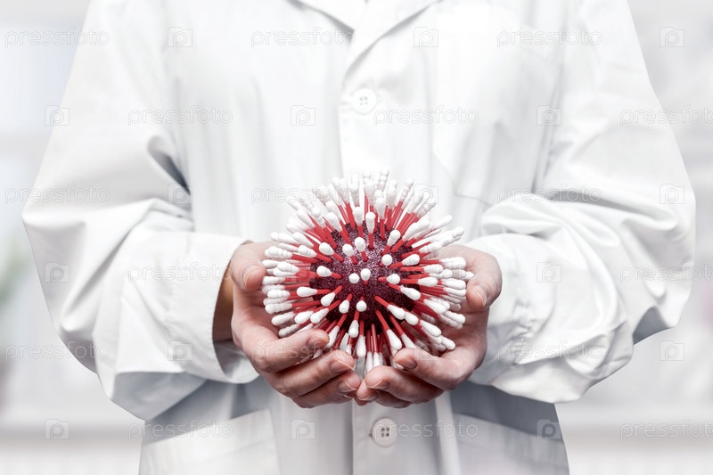 Доктор в белом халате держит имитацию вируса на ватных тампонах