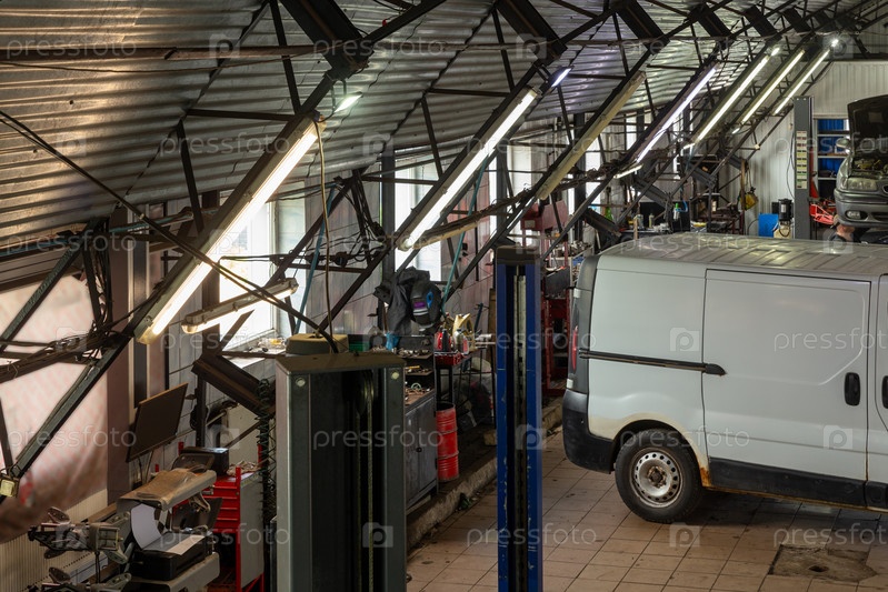 Автомобили в автосервисе. Современная авторемонтная станция с большим количеством подъемников и специализированным оборудованием для диагностики и сервисного ремонта автомобилей