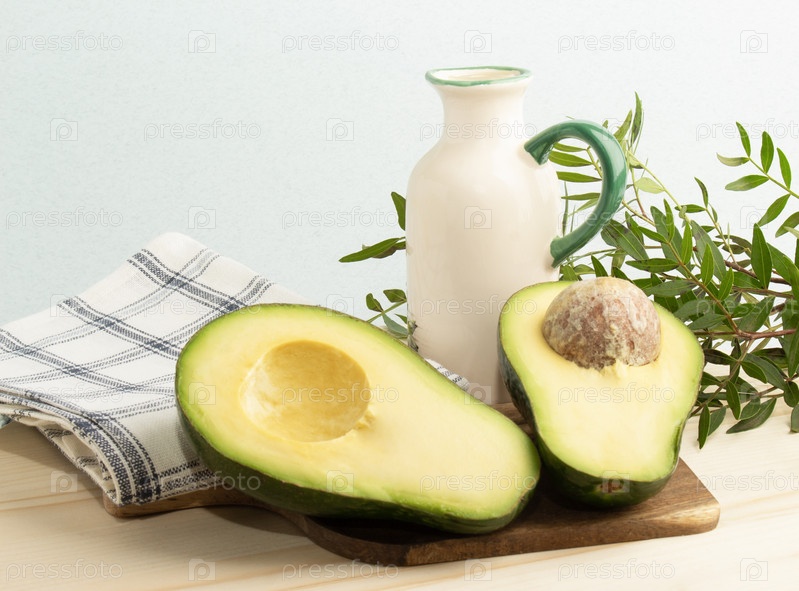 Две части свежего авокадо, графин со сливочным маслом