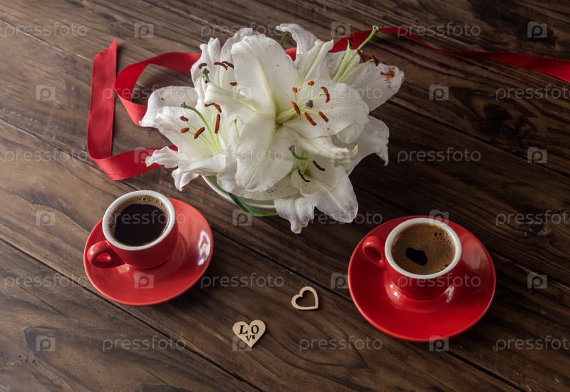Натюрморт ко Дню святого Валентина с лилиями и кофе
