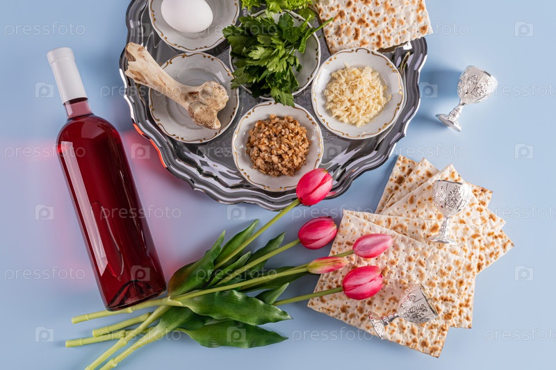 Красивое блюдо с праздничной едой к еврейскому празднику Песах. маца, орехи, листья салата, петрушка, фруктовая паста. Вид сверху. синий фон