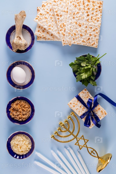 Традиционное угощение к еврейскому празднику Песах – малый подсвечник, маца. Вид сверху. Вертикальный праздничный фон. рамка. место для текста