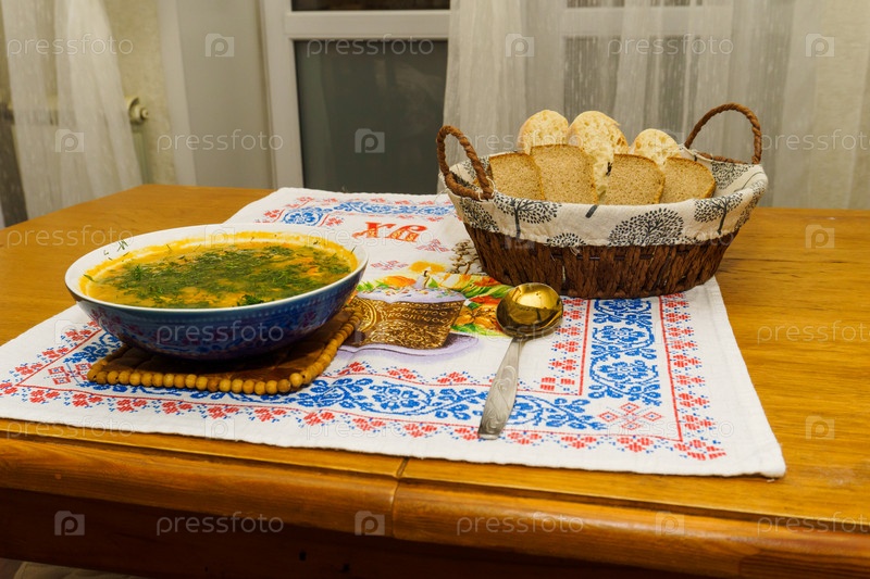 Гороховый суп и хлеб на салфетке с пасхальным рисунком. Постные блюда