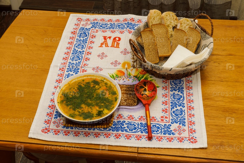 Гороховый суп и хлеб на салфетке с пасхальным рисунком. Постные блюда