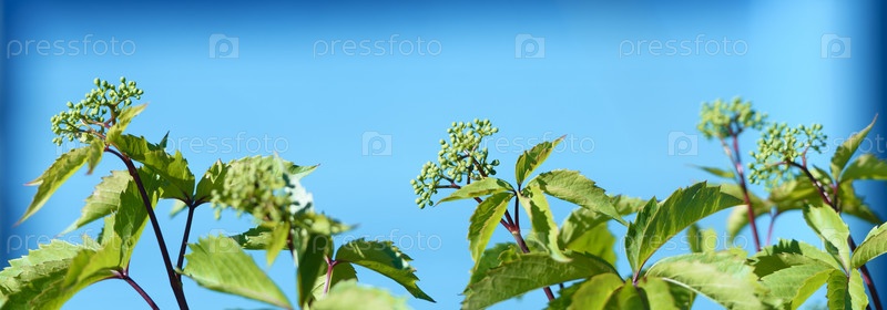 Листья зеленой травы на синем фоне - панорамный вид