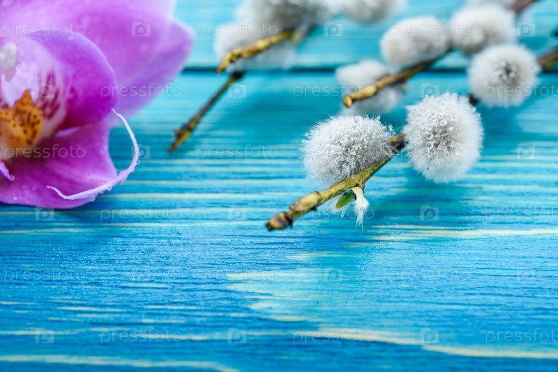 Цветы ивы на синем деревянном фоне