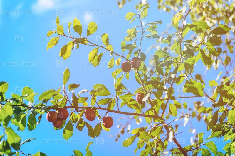 Сливы на ветвях деревьев на фоне голубого неба