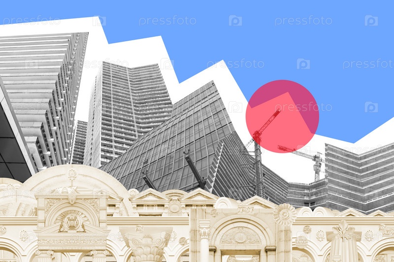 Городская среда и городская жизнь. Сюрреалистический арт-коллаж с элементами архитектурных деталей, фасадов зданий, строительных площадок. Смешанный промышленный фон современной и исторической архитектуры