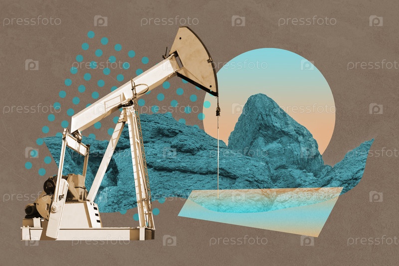 Прикольный коллаж с промышленной нефтяной вышкой. Художественный плакат, концептуальный дизайн шаблона или обложка журнала. Насос Джек