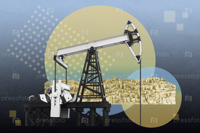 Прикольный коллаж с промышленной нефтяной вышкой. Художественный плакат, концептуальный дизайн шаблона или обложка журнала. Насос Джек