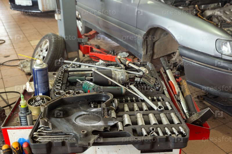 Избирательный фокус ящика с инструментами механика с инструментами в ящиках. Запчасти для автомобилей на полках